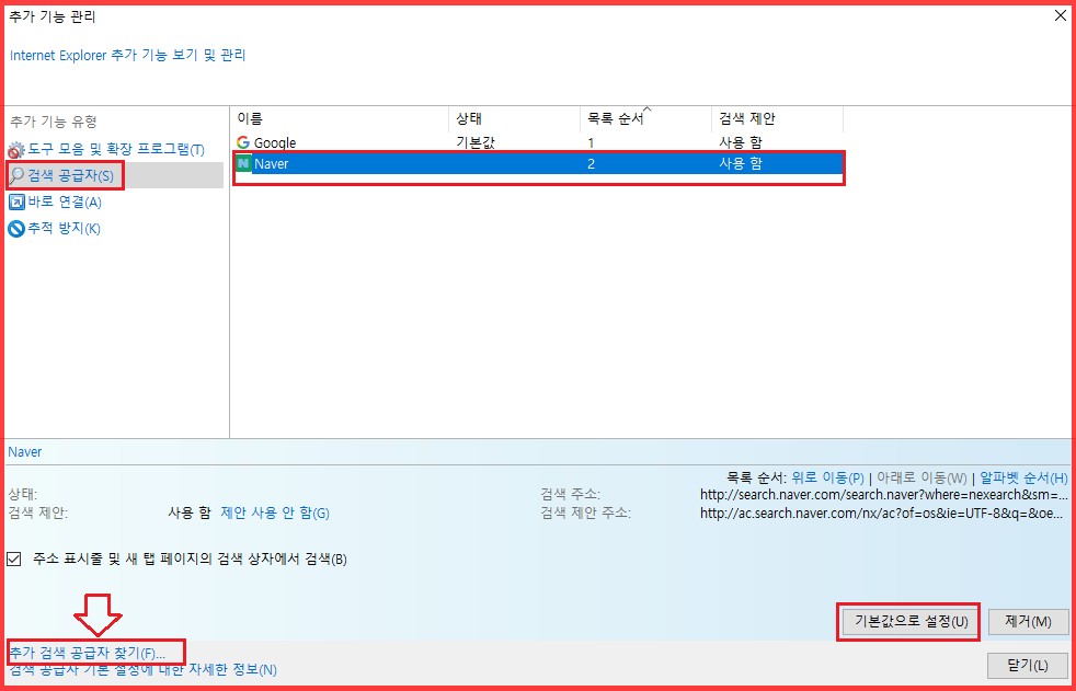 추가 바로 연결 찾기의 경우에는 위에 안내한 검색 공급자 추가와 같은 페이지가 뜨니까요.