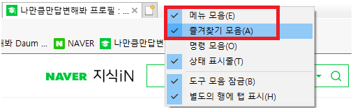 메뉴 모음과 즐겨찾기 모음에 체크하면 됩니다.