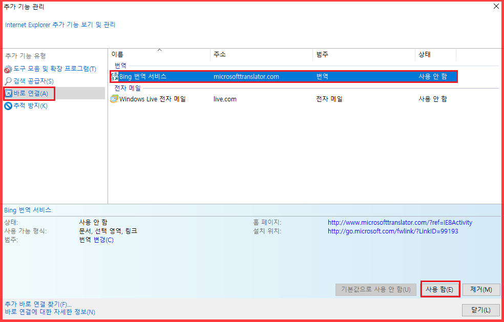 Bing 번역 서비스가 보이지 않는다면