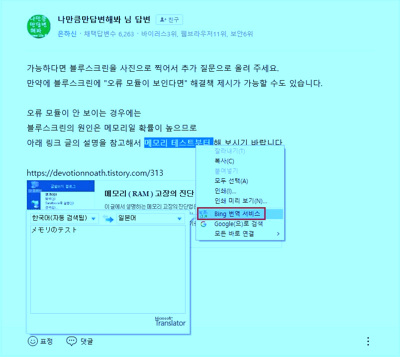 마우스 오른쪽 버튼을 누르면 뜨는 문맥 메뉴에서 보이는 "Bing 번역 서비스"를 말한다고 보면 됩니다.
