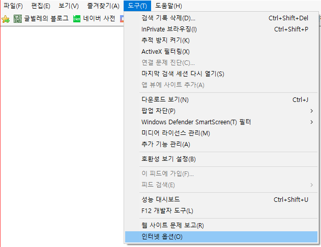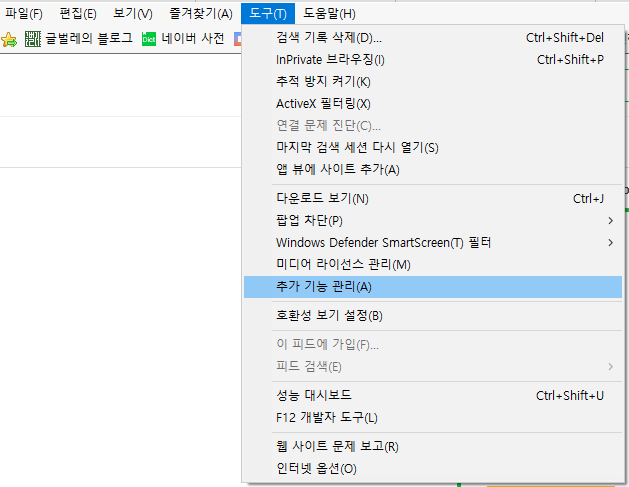 인터넷 익스플로러 메뉴 줄에서