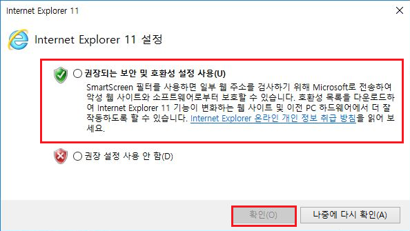 권장되는 보안 및 호환성 설정 사용에 체크 후에