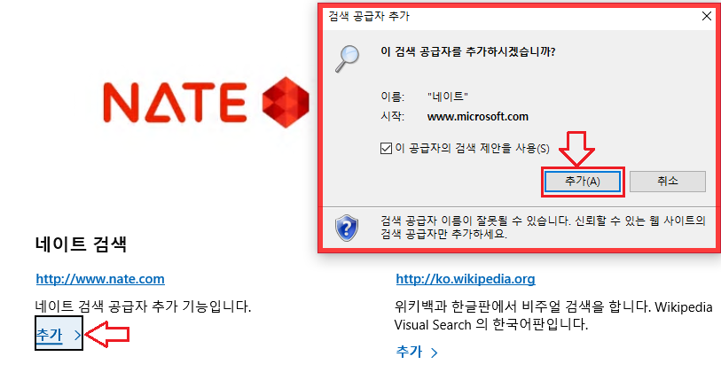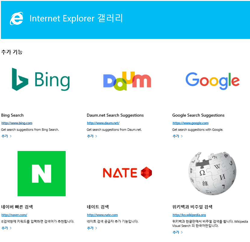 위 스샷에서 빨간 화살표로 표시한 추가 검색 공급자 찾기를 누르면 뜨는 페이지에서