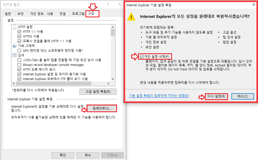 개인 설정 삭제에까지 체크를 하고 다시 설정 버튼을 누르면 됩니다.