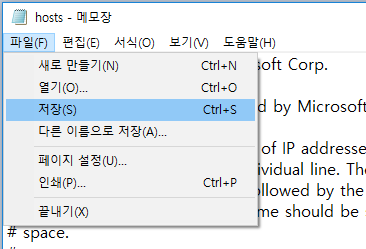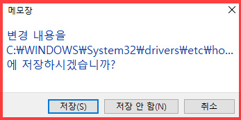 그런데 주의를 하실 점은 호스트 파일을 편집 후에 그냥 메모장 창 닫기를 눌러서