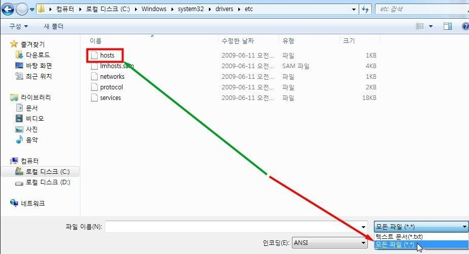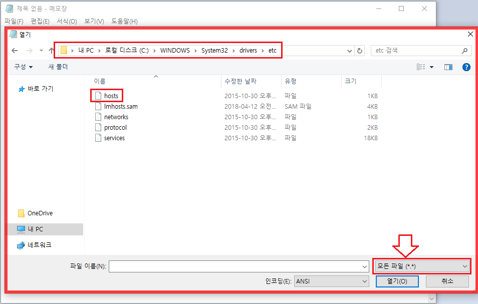 그런데 메모장에서 위의 경로를 열었을 때 처음에는 호스트 파일이 보이지 않습니다.
