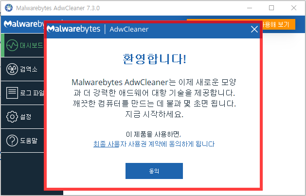 여기에서 동의를 해 주어어야 AdwCleaner 사용이 가능합니다.