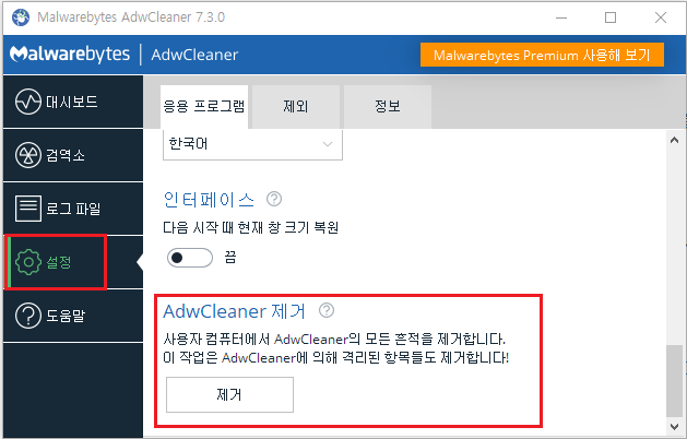 설정 탭의 맨 아래에 보면 AdwCleaner를 흔적도 없이 제거하기 옵션도 있음도 참고하시고요.