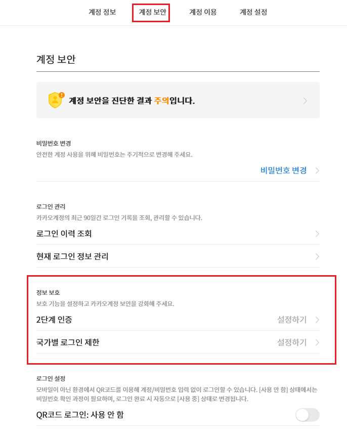 계정 보안 탭을 클릭하면 주의 상태일 겁니다.