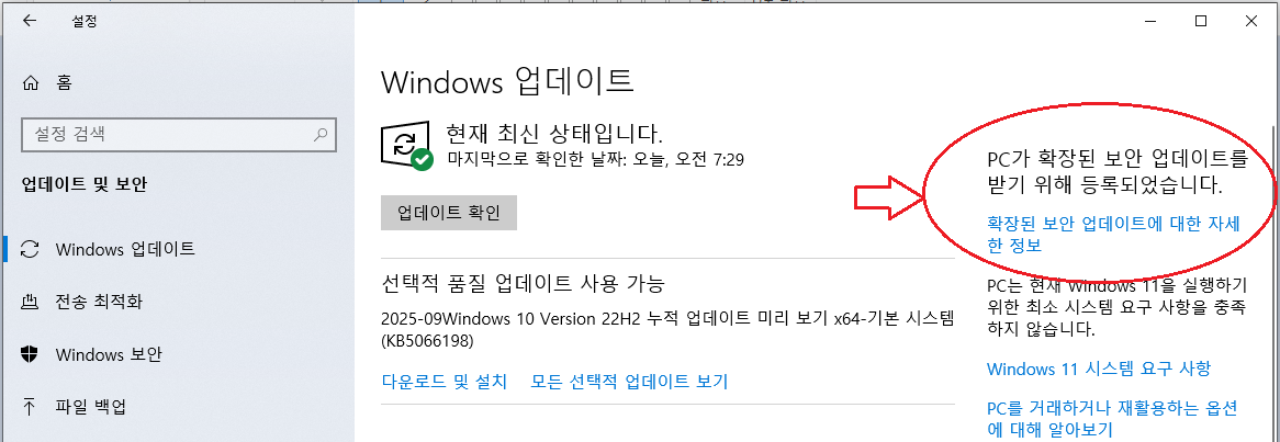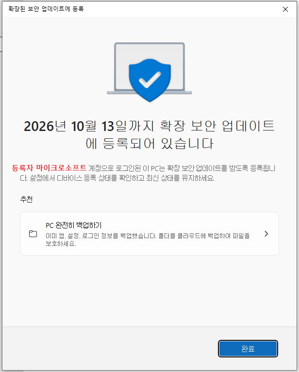 윈도우 10 ESU에 등록이 됩니다 (물론 PC 사양이 된다면 윈도우 11로 무료 업그레이드도 됩니다).