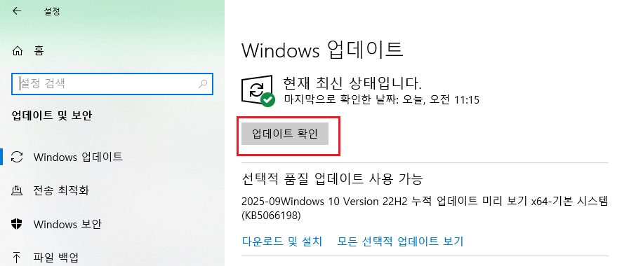 윈도우 업데이트가 최신 상태인지 확인.