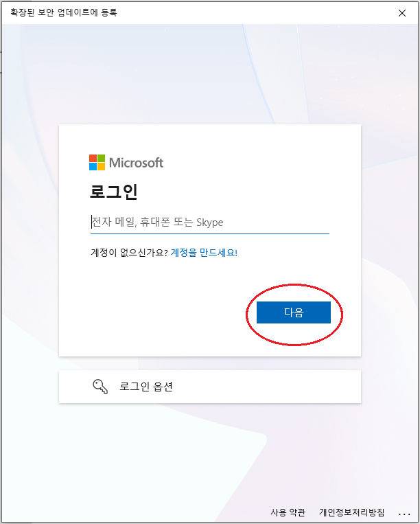 위의 창에 마이크로소프트 이메일 아이디를 적고 다음을 누르면