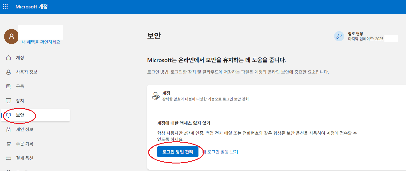 마이크로소프트 계정 페이지는 로그인 상태로 뜨게 되는데요.