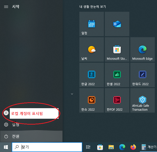 또 아래 스샷에서 보이는 거처럼 시작> 설정 등이 표시되는 곳의 계정 표시도 로컬 계정으로 표시됩니다.