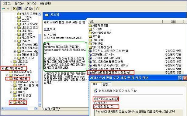 그래서 뜨는 레지스트리 편집 도구 사용 안 함 등록 정보창에서