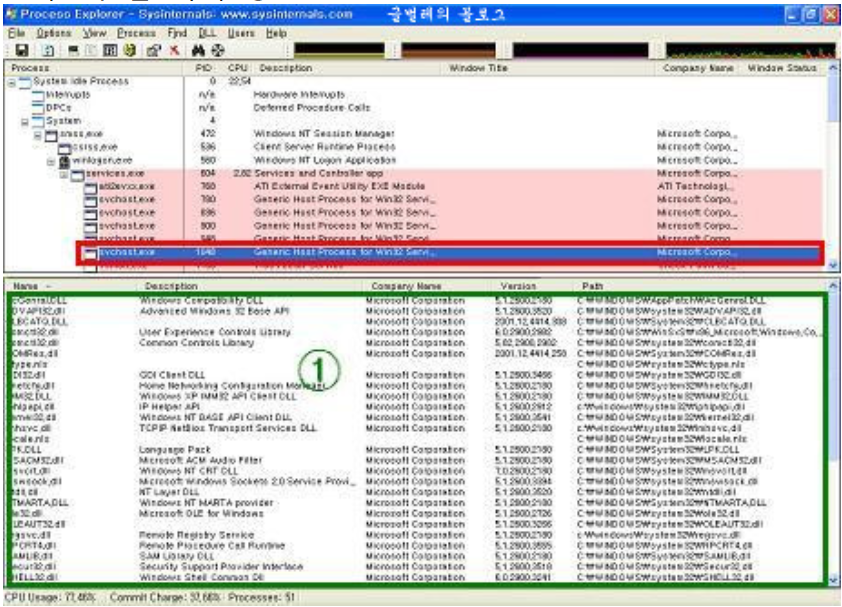 그러므로 svchost.exe들중에 악성코드로써 침투된 게 있다면 금방 파악이 가능할 겁니다 .