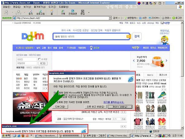 이렇게 조치를 하고 나서도 많은 경우 오류가 난 인터넷 익스플로러가 짧아도 일 분 이상은