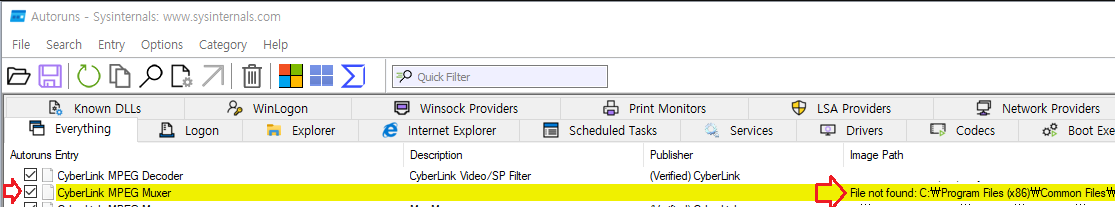 리로드된 autoruns에서 file not found라고 표시된 줄들 앞의 체크들을 해지하세요.