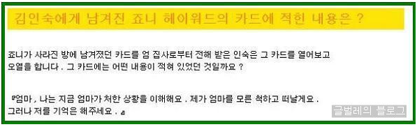 방송국 홈페이지까지 들어가서 인숙의 모습을 죠니에게 보여 주었다고 합니다.