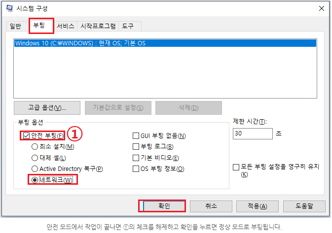 [그림1]의 다운로드를 완료하지 않거나 완료하지 못한 경우에는 안전모드- 네트워킹 사용으로